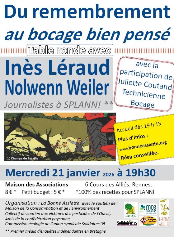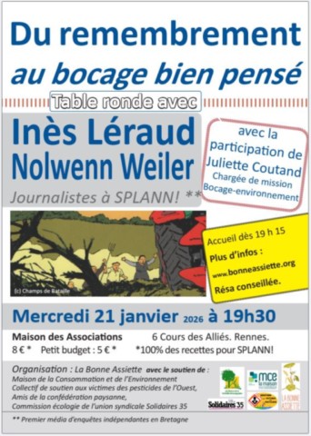 avec le soutien de : Les amis de la Confédération Paysanne, Commission écologie de Solidaires 35, Collectif de soutien aux victimes des pesticides de l'Ouest, Maison de la Consommation et de l'Environnement.