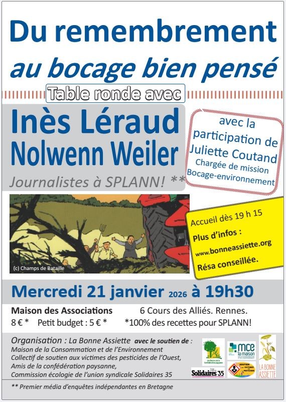 avec le soutien de : Les amis de la Confédération Paysanne, Commission écologie de Solidaires 35, Collectif de soutien aux victimes des pesticides de l'Ouest, Maison de la Consommation et de l'Environnement.