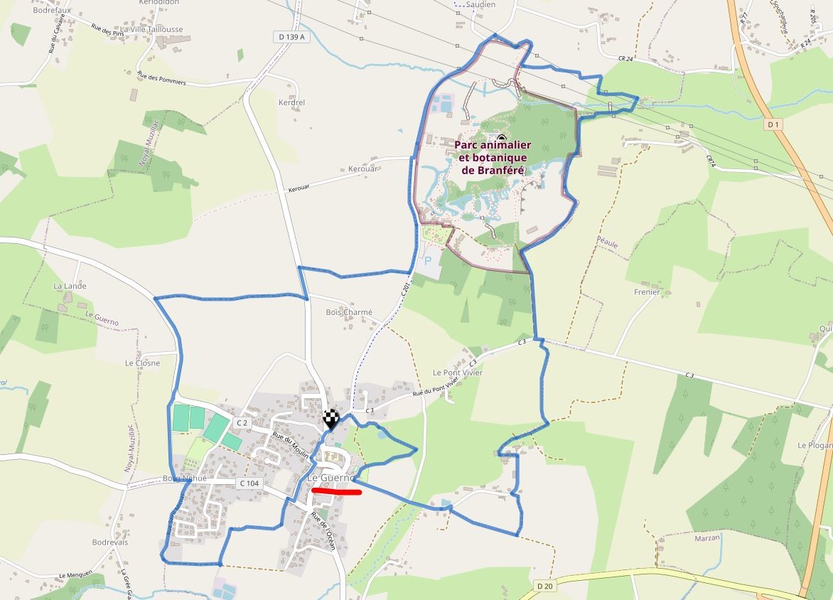 Du village Vacances les Gabelous, rejoindre la commune du Guerno, distance de 10 km (passer au-dessus de la 4 voies)
