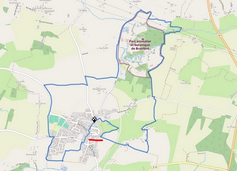 Joli bourg classé. Le chemin contourne le parc de Branféré. Balisage trait jaune.